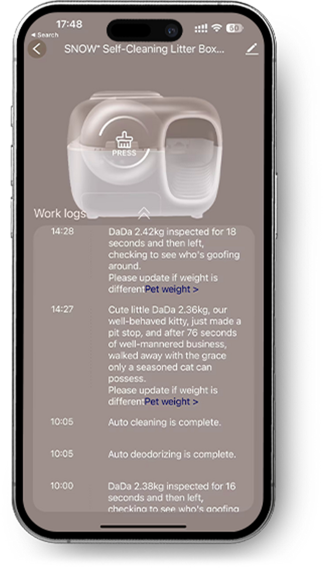 Autonettoyant après chaque utilisation. Il suffit d'un clic sur votre téléphone pour que PetSnowy s'occupe de l'élimination de la litière à votre place.